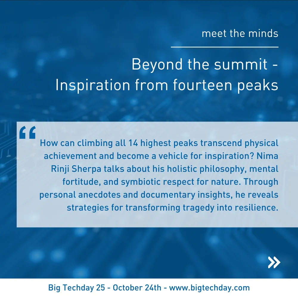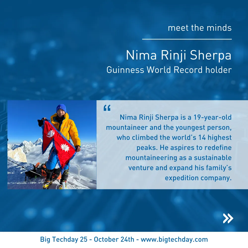 October 2nd, 2025What drives someone to push beyond their limits and achieve greatness? Nima Rinji Sherpa, the youngest person to summit all 14 of the world's highest peaks, will share his story and philosophy in his talk "Beyond the summit - Inspiration from fourteen peaks".