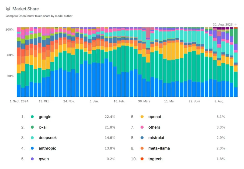 Briefly this Sunday, TNG's two R1T und R1T2 LLMs, constructed in Germany from DeepSeek parts, together reached top 10 market share on OpenRouter, the world's largest LLM aggregator. They peaked at 9.42B tokens/day, 1.8% of OR's total throughput.