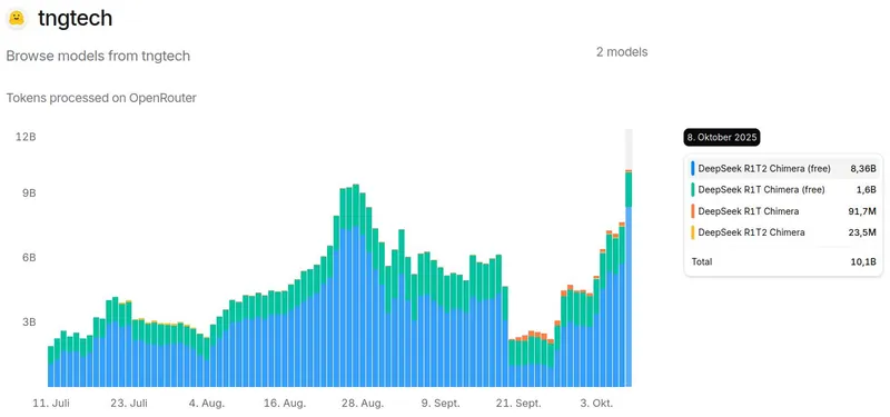 On October 8th 2025, the TNG Chimera family of 671B child models, constructed from DeepSeek AI parent Large Language Models, processed in excess of 10 billion tokens/day on OpenRouter for the first time. You can find more information on our model here.