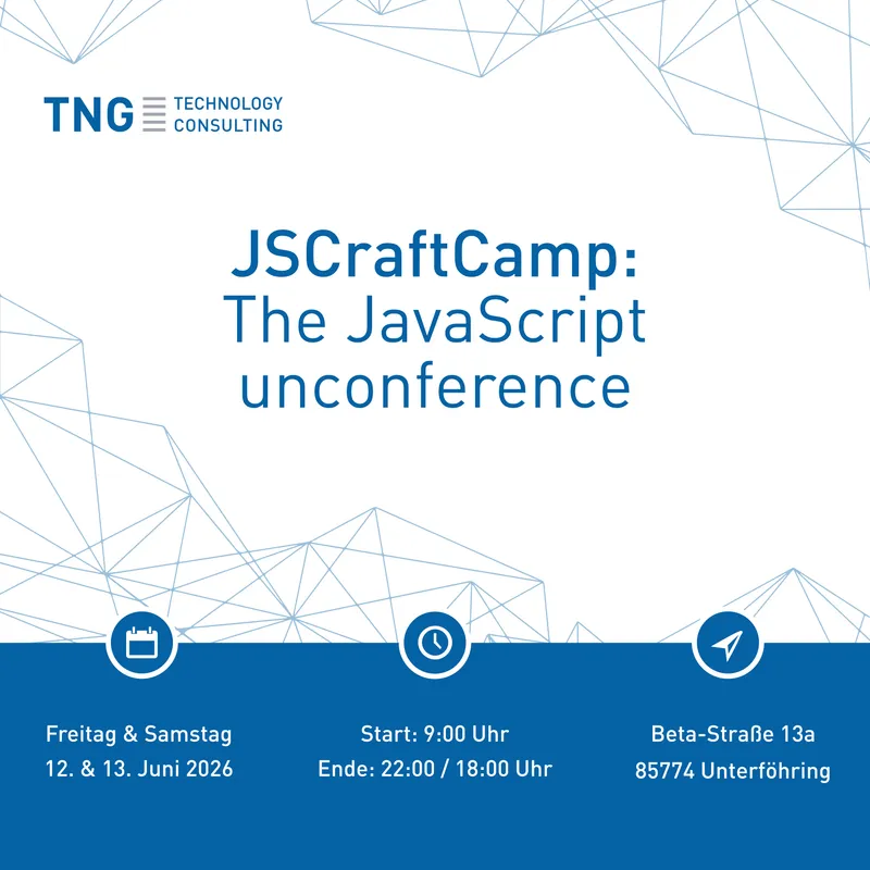 Vom 12. bis 13. Juni veranstaltet TNG das diesjährige JSCraftCamp mit mehr als 100 Teilnehmerinnen und Teilnehmern an unserem Hauptsitz in Unterföhring. Seit fast zehn Jahren bringt die JavaScript-Unkonferenz Entwicklerinnen und Entwickler zusammen - kostenlos und von Freiwilligen organisiert. Das Event wird von den Gästen selbst gestaltet: Sie erstellen die Agenda und leiten die Diskussionen, wodurch ein echtes Community-Erlebnis entstehen kann. Freuen Sie sich auf zwei Tage mit BarCamp- und Open-Space-Sessions, gefolgt von einem Get-together am Freitagabend. Die Anmeldung ist über die Website des JSCraftCamps möglich.